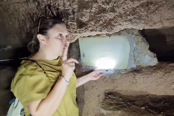 The entrance is an inconspicuous metal gate. There is no electricity in the tunnels so we were all given a flashlight. Most tombs were excavated out of the sandstone, in Phoenician-style Kochim or multi-story oven tombs, others are dug in the floor. There are also a few sarcophagi in arched recesses (arcosolia). Some of the burial chambers are decorated with frescoes, exquisite-colored paintings with Jewish motifs. The memorial plaques are all in Latin or Greek, not in Hebrew.